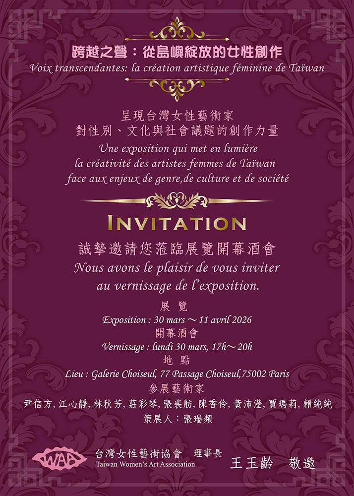 At the invitation of Centre Culturel et Artistique Franco-Chinois, the Taiwan Women’s Arts Association will present the exhibition *Voices Across Borders: Women’s Creations Blooming from the Island* at the Galerie Choiseul, located in the Passage Choiseul, a French heritage building in the 2nd arrondissement of Paris, near the Paris Opera. The exhibition runs from March 30th to April 11th. The exhibition brings together the creative energy of nine Taiwanese female artists, showcasing the diverse facets of contemporary Taiwanese women’s art.