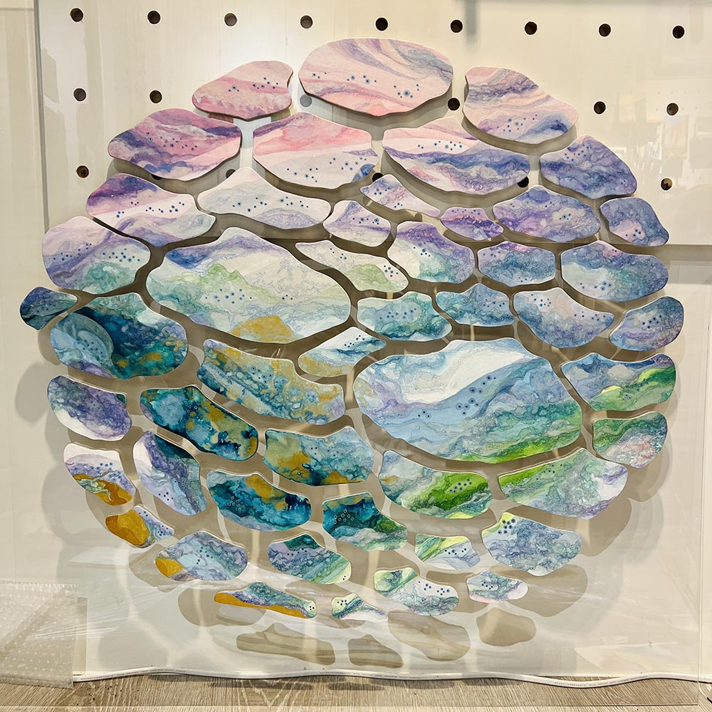 Her early works primarily used red circles as her visual vocabulary, symbolizing the connection and tension between emotion and reality. Later, she gradually transformed into the “Blue Mushroom Series,” centered on blue circles, using forms that exist between biological and symbolic forms to respond to the coexistence and fluidity of life within the natural environment.